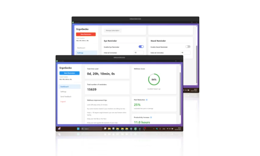 The all-in-one tool for desk worker pain relief. Get automatic reminders for eye breaks, posture adjustments, and movement.